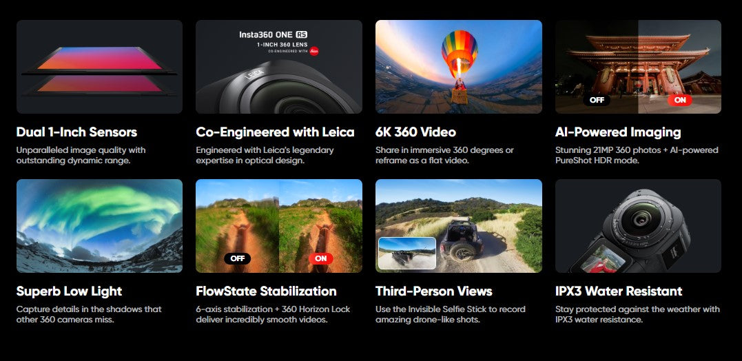 The One RS- 1 inch 360 camera from Insta360 is truly an amazing camera from any angle. Within its small size, it offers advance features such as its lens design, impressive 360 captures, outstanding sharp definition, low light sensor, advance flow-state stabilization, horizon lock, amazing third-person view mode, ai imaging, HDR and many other features.