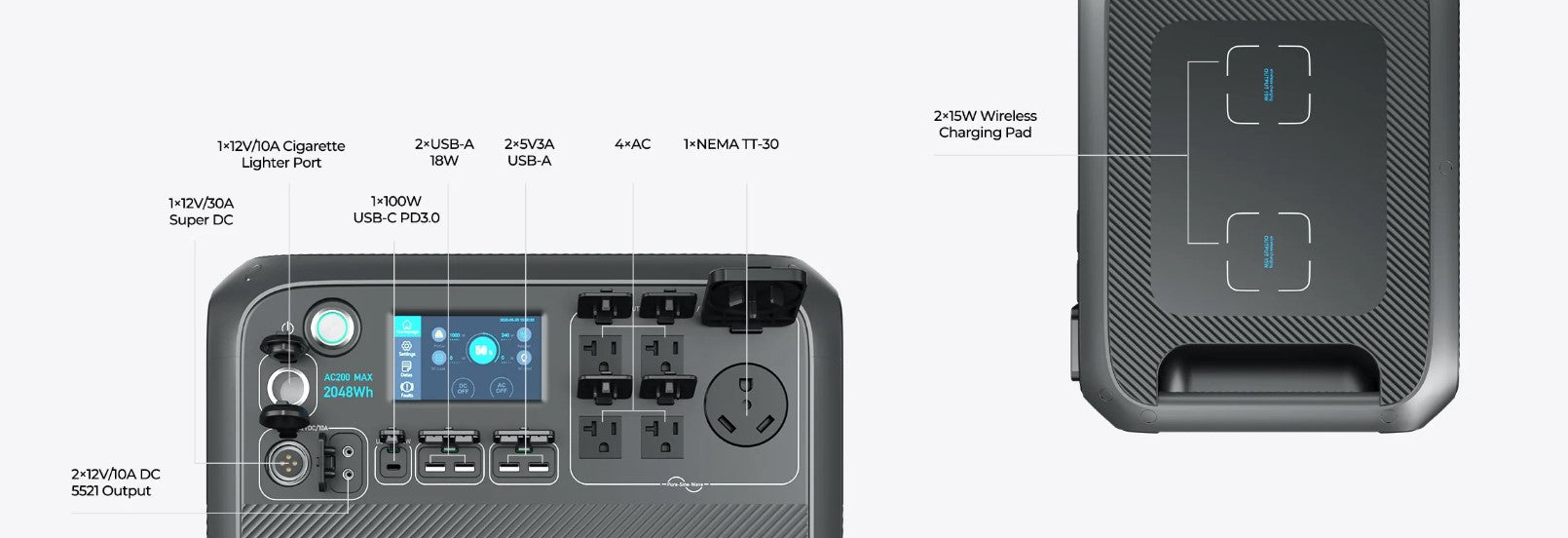 This is Bluetti AC 200 Max power station. This power station can also be expanded with other accessories such as battery or adding solar panels. Features with different output ports for different needs; including two wireless charging pad. For your convenience it can be controlled and motored by smart app. This AC 200 Max power station is powerful and functional.