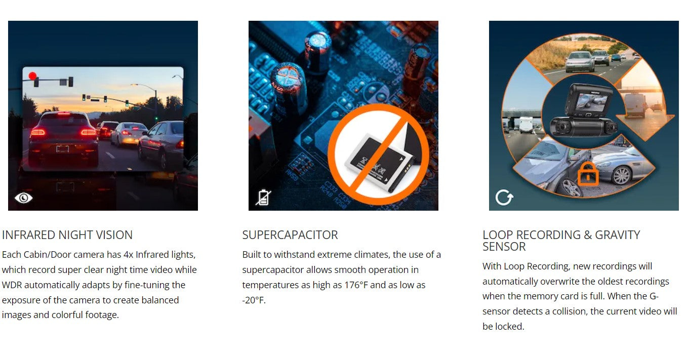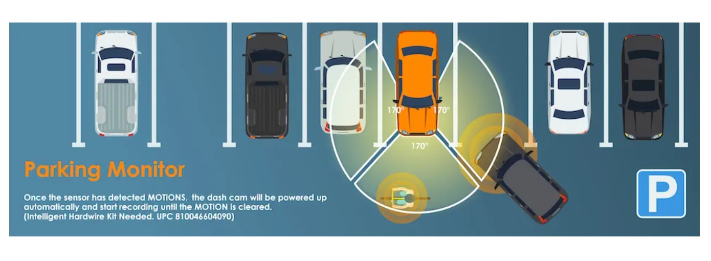- Parking Monitoring: the dash cam will automatically turns on when it detects motions or vibration OR set it to record 24/7 format time - lapse video (Optional smart/intelligent hardwire kits is required for this parking monitoring feature)
