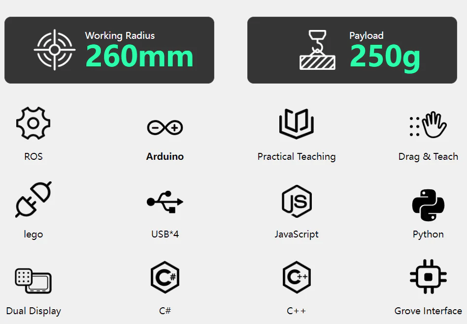 Small and functional, this compact robotic arm is developed with features and technologies. This compact robotic arm features expansion interface, flexible , efficient parts, smart platform and durable structure, it is an ideal choice for both STEM purpose and makers.