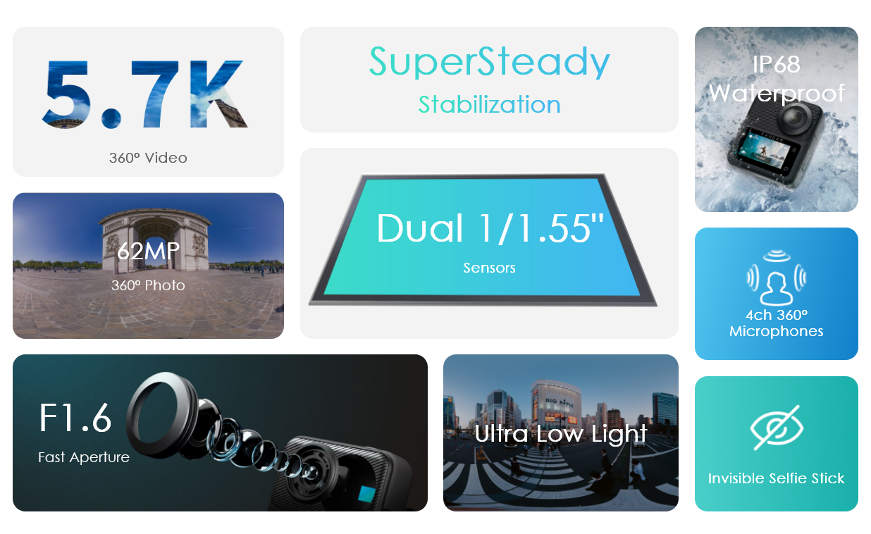 - Up to 5.7K 360 video