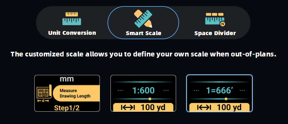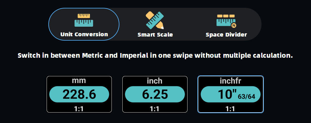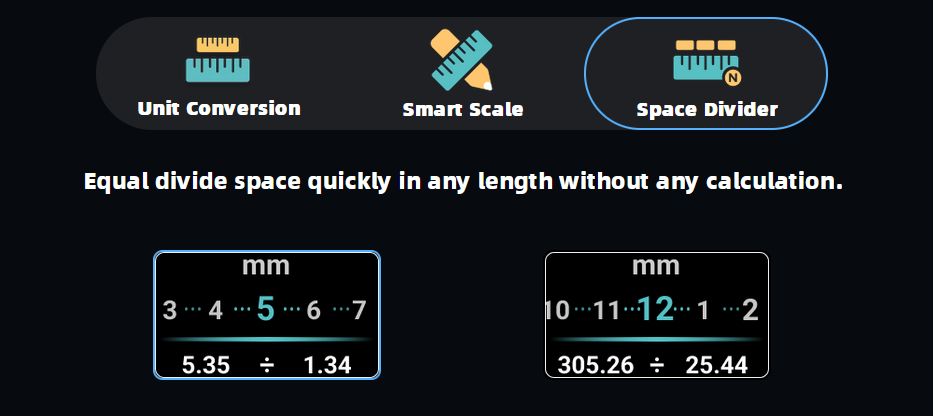 Now you can measure in any scale with this digital ruler. No matter how you want to use it : reading measurement, drafting, measuring or drawing, this digital ruler can help to make things easier. With its design, it can be measure in different unit for different purpose, customize scale for your specific needs, and can equally divide space without calculation.