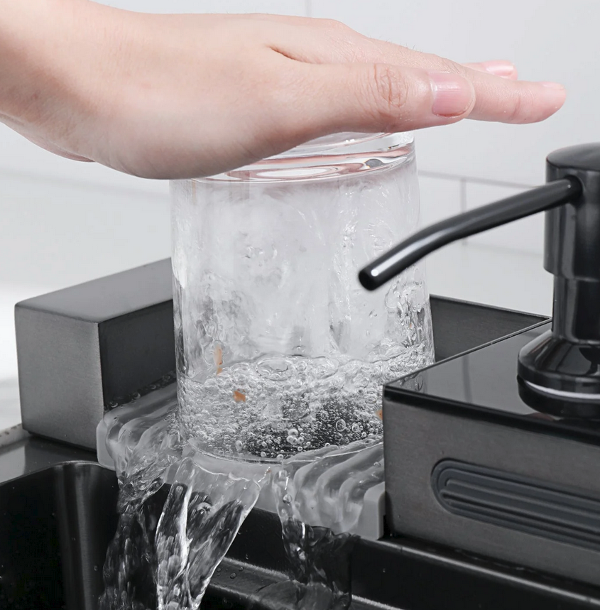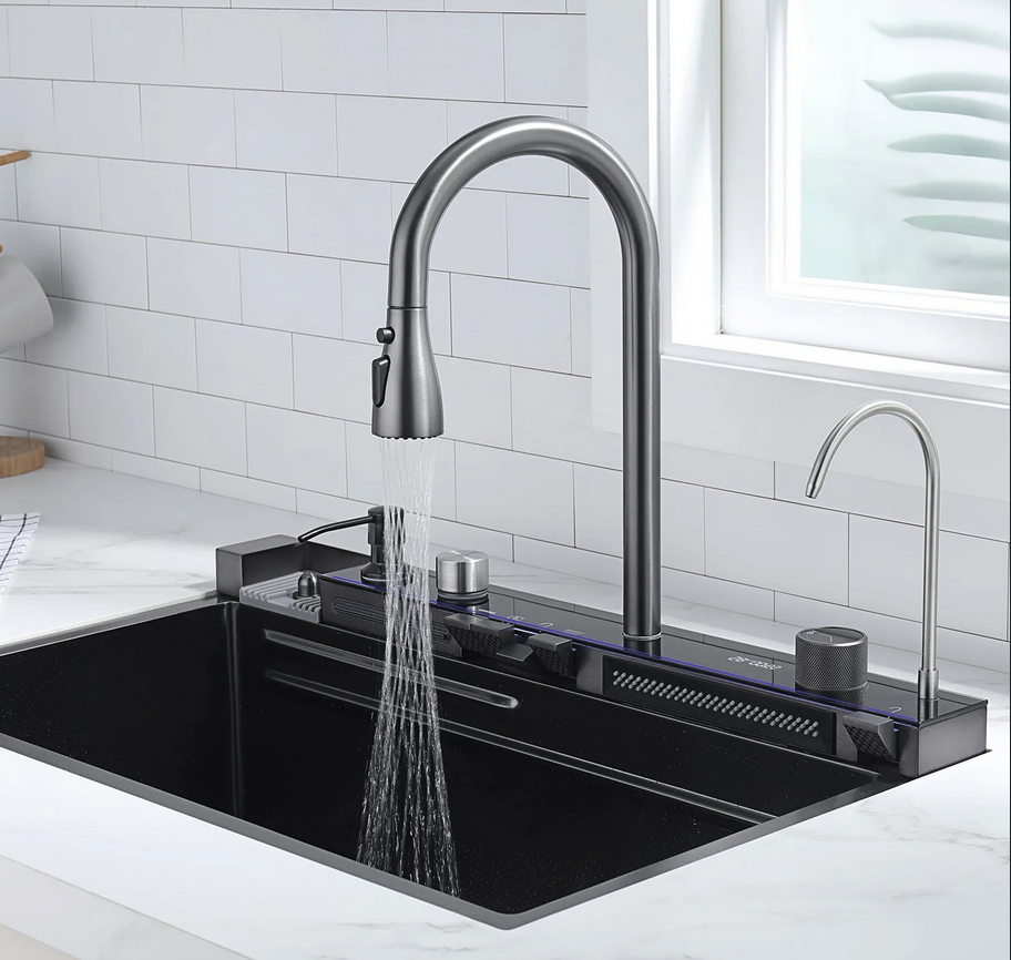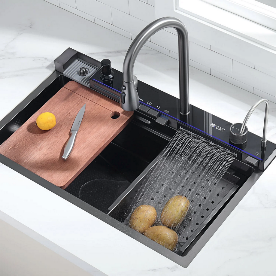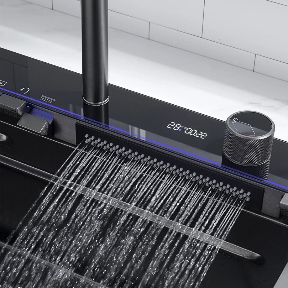 Make your everyday housework easier, cleaner and more functional with this smart kitchen sink. With its modern design, it has digital temperature, LED lighting, waterfall faucets, pull-out faucet cup rinser, special design nano-coating and elegant honeycomb coating surface, and much more.
