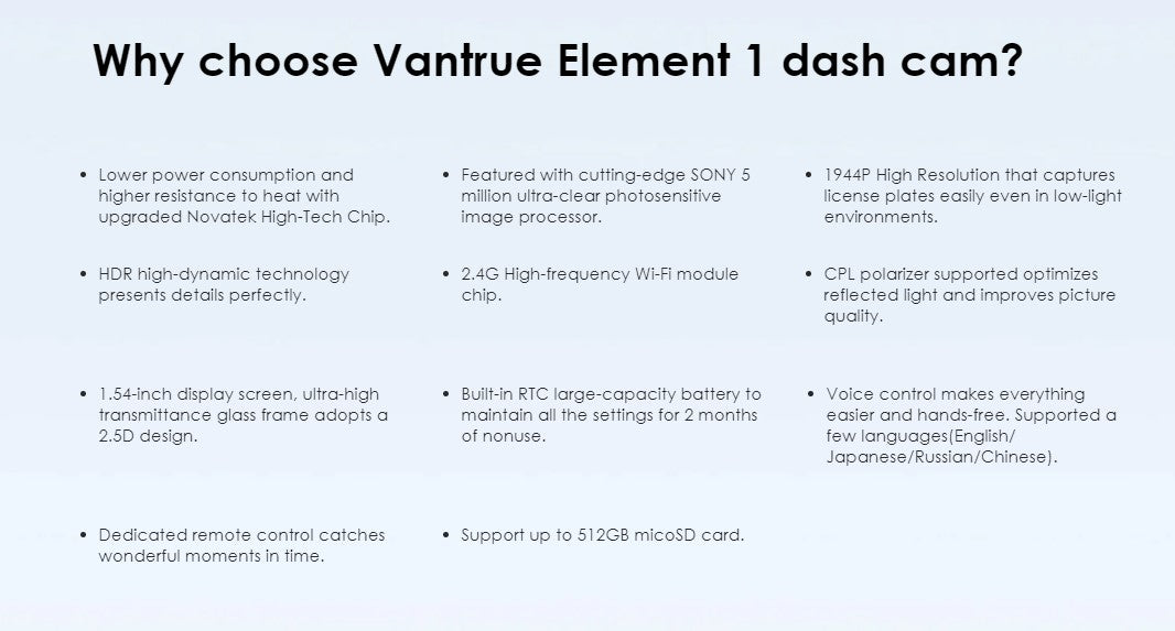 If you are looking for a mini size dash cam with advance features that give you a peace of mind; then this dash cam is for you. Small in size, but big in features such as: build-in GPS, voice control, remote control for hotkeys, Wifi connect, app, HD recording, and many other features