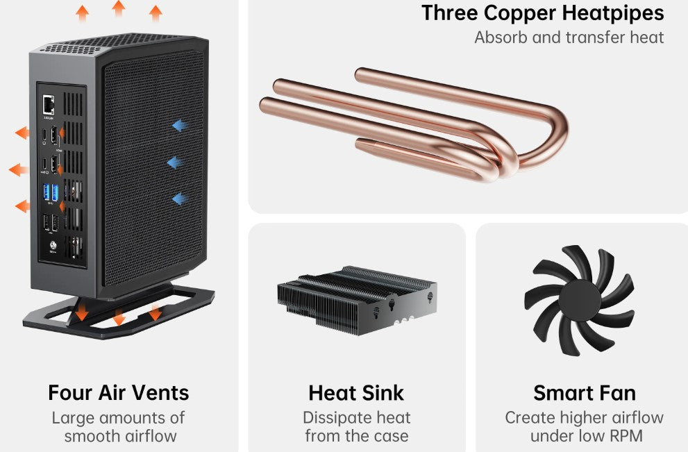 - Advance cooling design with 4 air vents, heat sink, 3 copper heat pipes and smart cooling fan