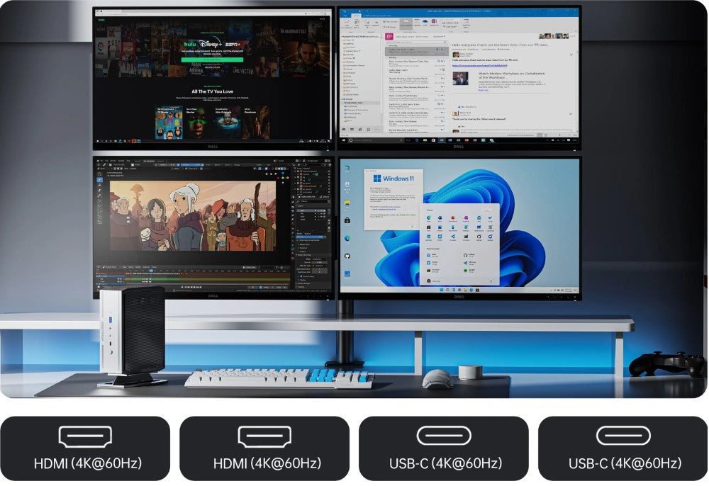 - 2 USB-C ports and 2 HDMI ports. This pc can provide up to UHD 4K at 60 Hz resolution-- can support quad display setup