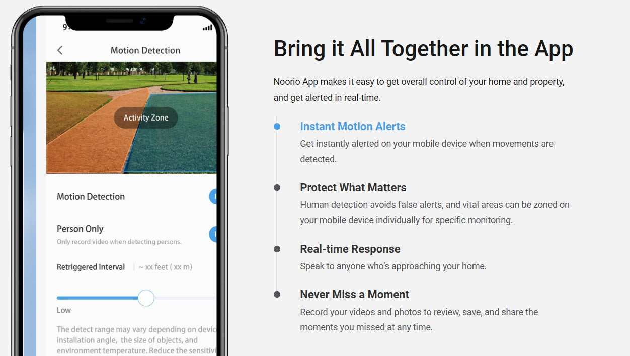 - Smart app for all the control and info: receive alerts, 2 way audio, area zoning, human detection, record video, taking photos, review, save and share.
