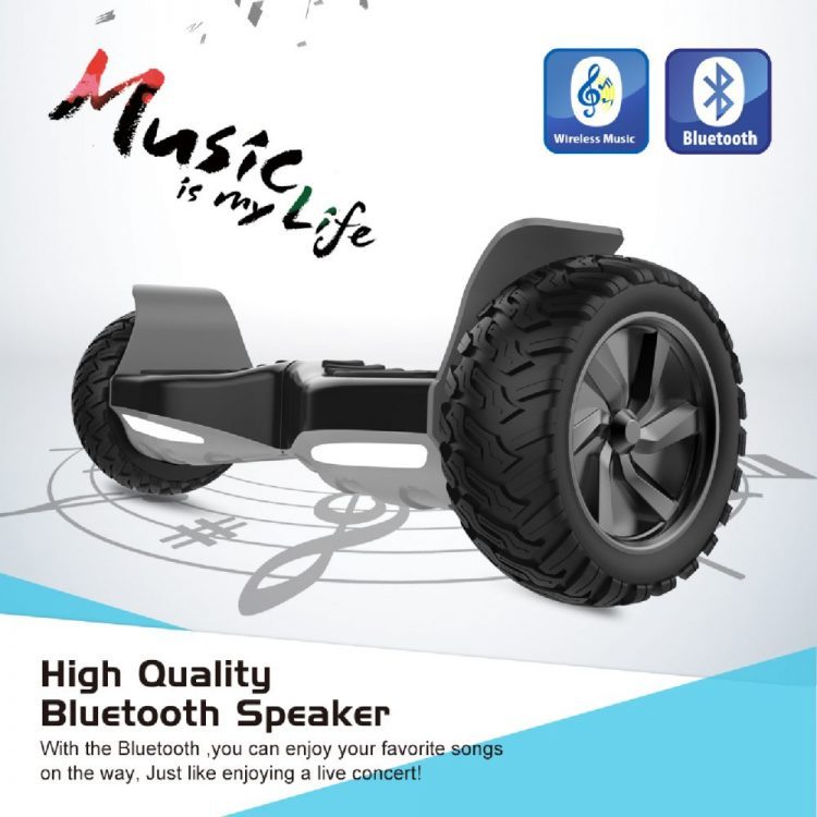 Introducing this all terrain hoverboard with a special design large wheels. Compare with other competitors, it offer user more space for foot. Come with advance bluetooth speaker, so that you can play music from your phone. Comes with front LEDs lights for extra style.