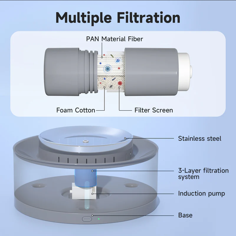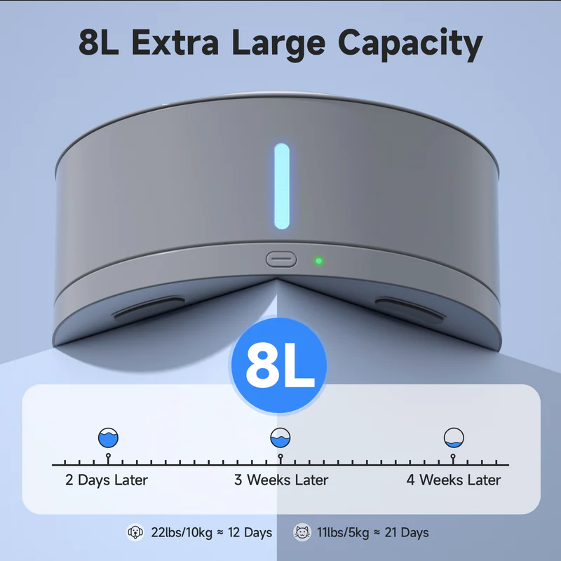 Your beloved dog will love this automatic water fountain ! It is developed with a wireless and quiet motor. Within its compact design, it has a large 8L water capacity; along with a advance filtration system. It also has a LED indicator light for water level, and it has a 304 food grade stainless steel; as well as BPA-free material.