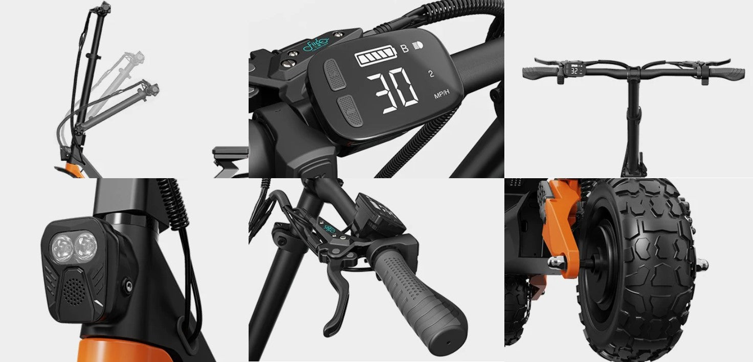 - Clear and large LED display for speed, millage, battery power status and ride mode; also with USB charging port