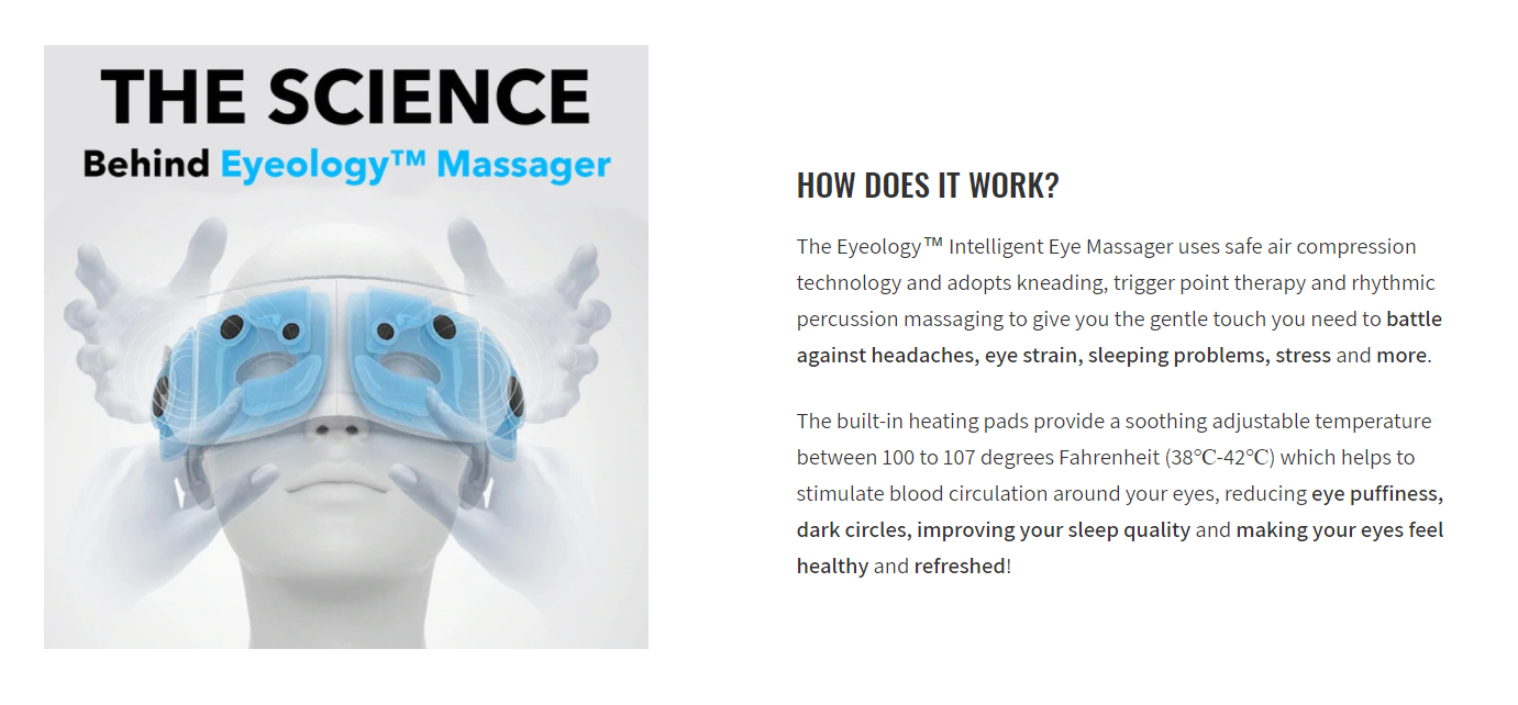 This eye massager make your eye relax by using warmth, acupoint and vibration massage. User can also connect the massager with your smart device, so you can enjoy your music or podcasts during the process.