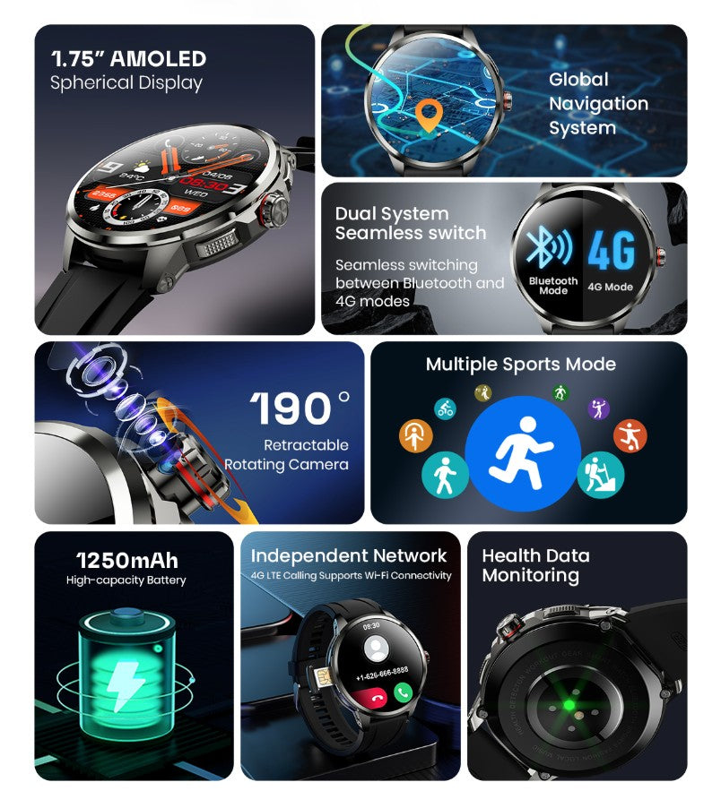 You want to have a smart watch that has all the smart features and convenience functions that make your life easier; this smart watch should be your option. It has features such as : High performance processor , Dual system bluetooth and 4G modes, 190 degree retractable rotating camera, support 4G LTE calling and WiFi connection, heath monitoring, HD AMOLED display and much more !!!