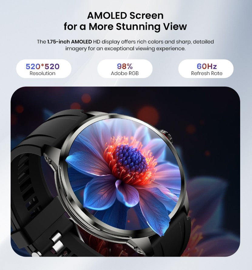 - Large and Clear 1.75" AMOLED Display - 520 X 520 Resolution, 60Hz refresh rate