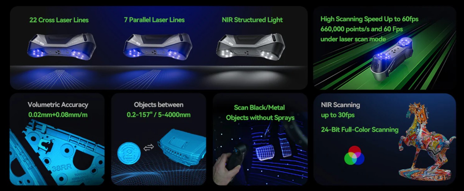 Now 3D scanning is never been easier and more accurate with this advance and powerful 3D scanner ! It is packed with features such as 22 cross laser lines, 7 parallel laser lines, high accuracy, can scan different items sizes, advance face mapping algorithm, high scanning speed and etc.