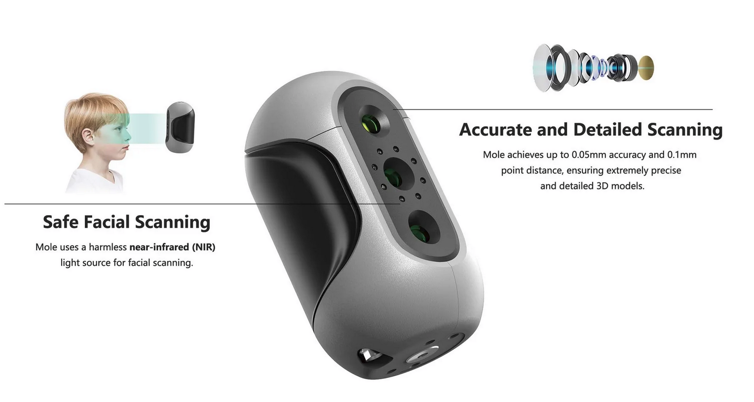 This professional 3D scanner is developed and designed with technologies that ensure all the details and high accuracy for scanning tasks. It can achieve up to 0.05mm accuracy and 0.1mm point distance for details. It also features safe facial scanning technologies; among many other features.