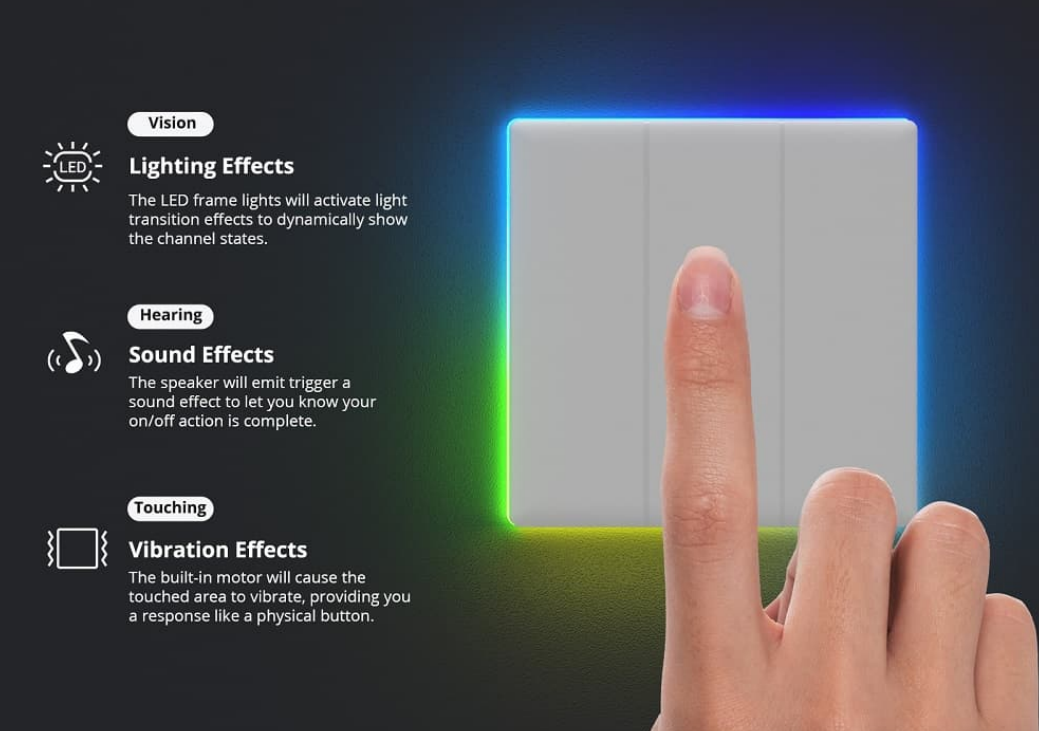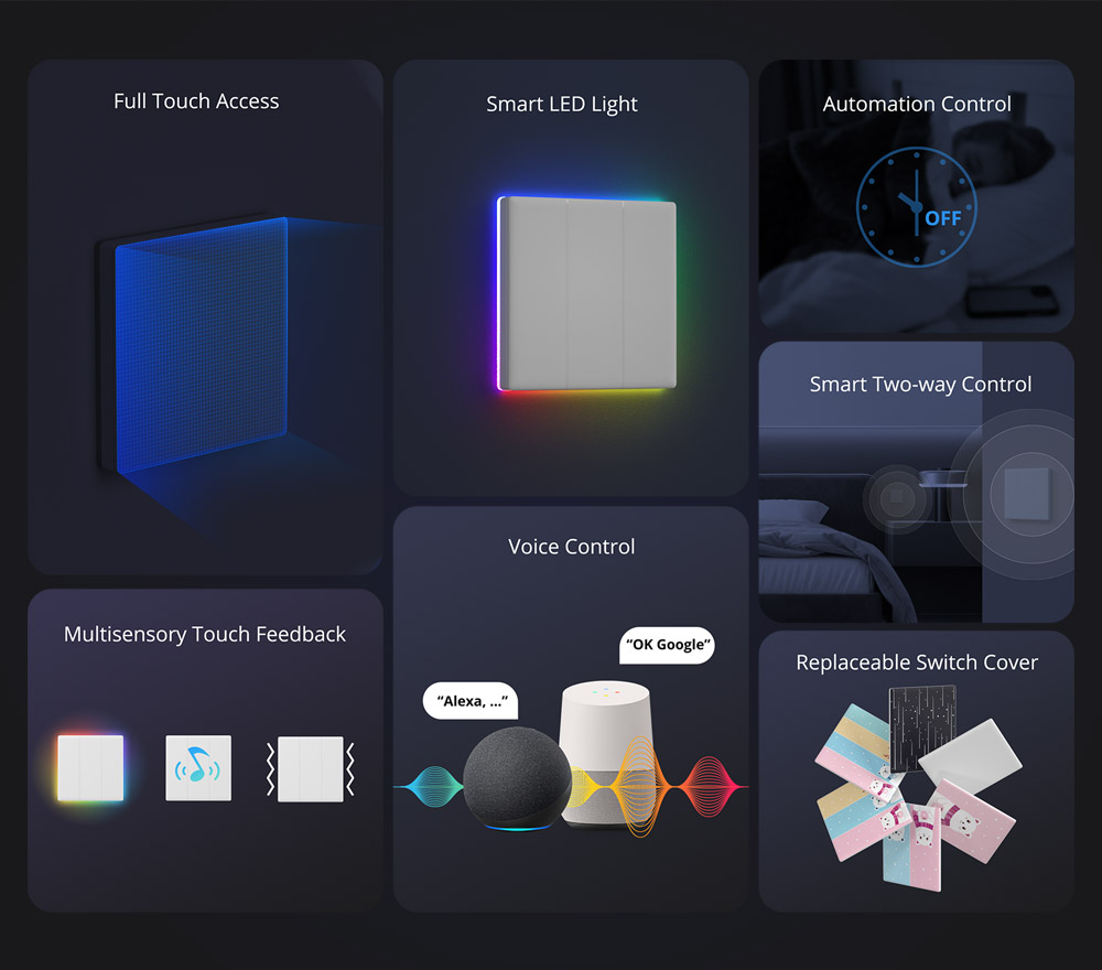 Change your regular wall switch with style with this very functional smart wall switch ! Modern design, it has an unique smart LED light that can be adjust. Also it has different touch feedback, automation setting, and much more. A single switch can offer you a lot of smart features.