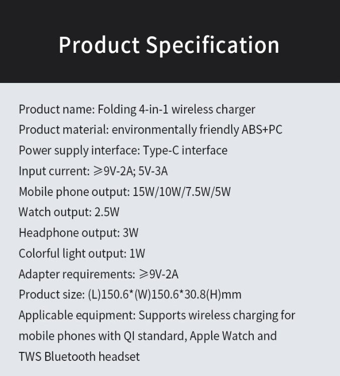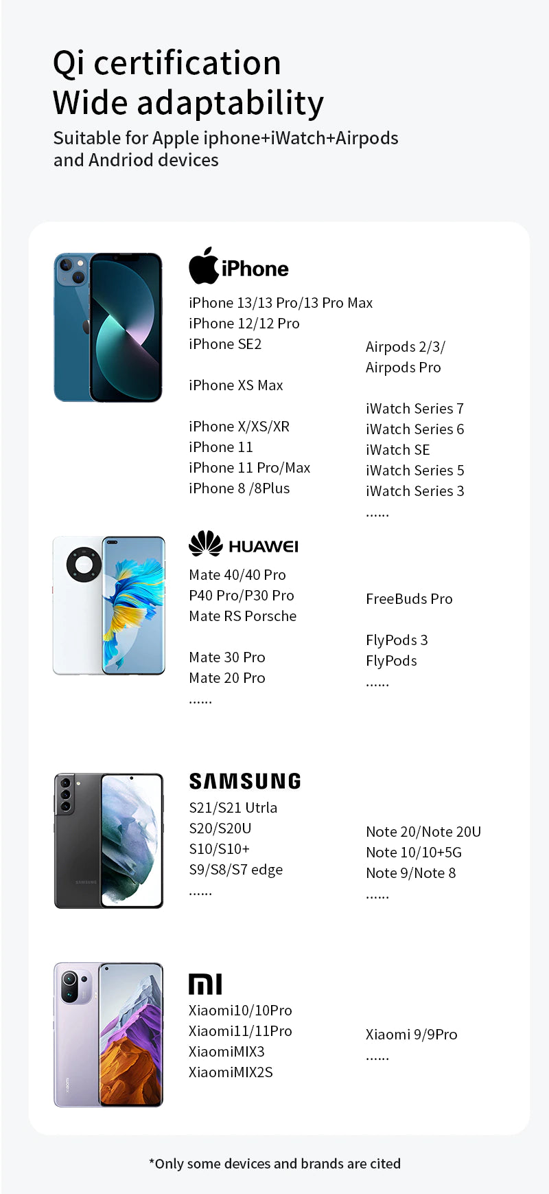 Notice: the wireless charging feature for smart watch and earbuds only support apple i-watch and apple airpod.