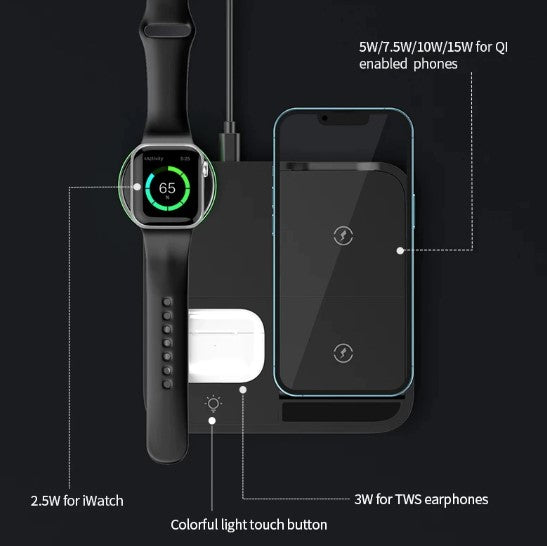 - Wireless charging pad for Qi compatible phones, apple i-watch and apple airpods