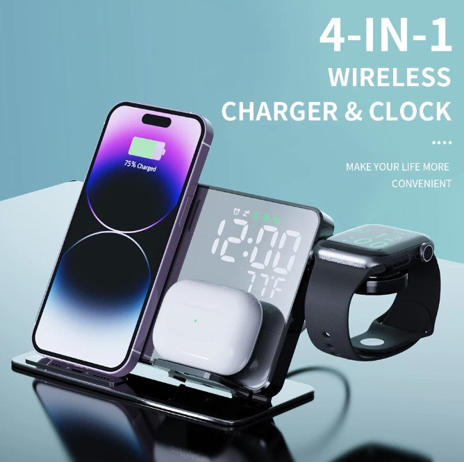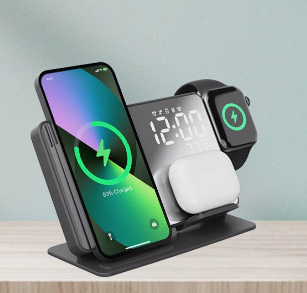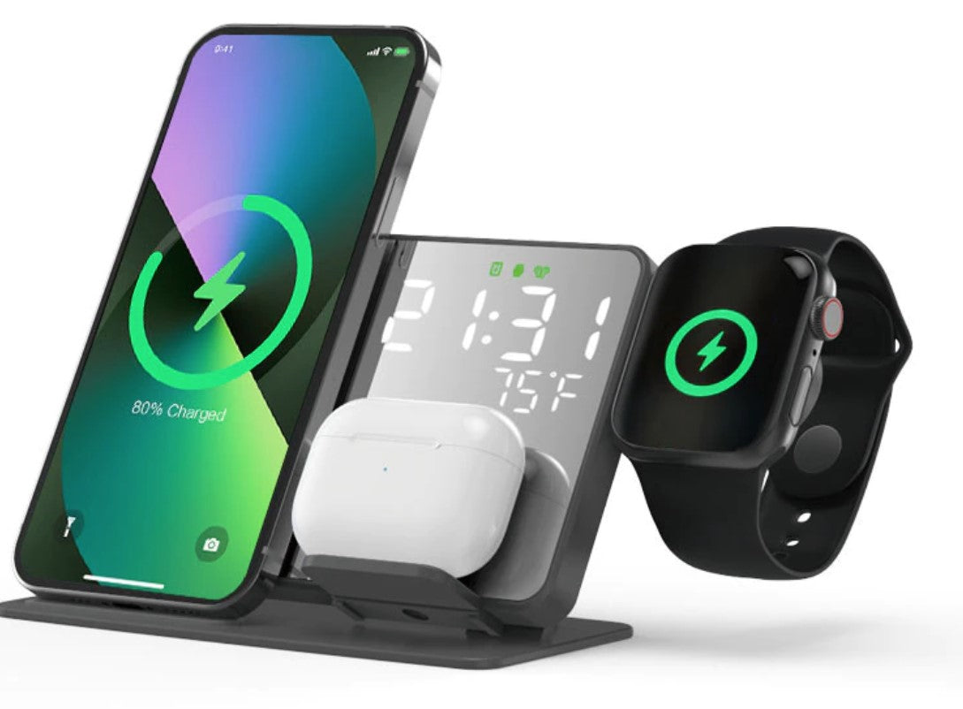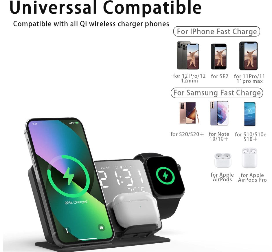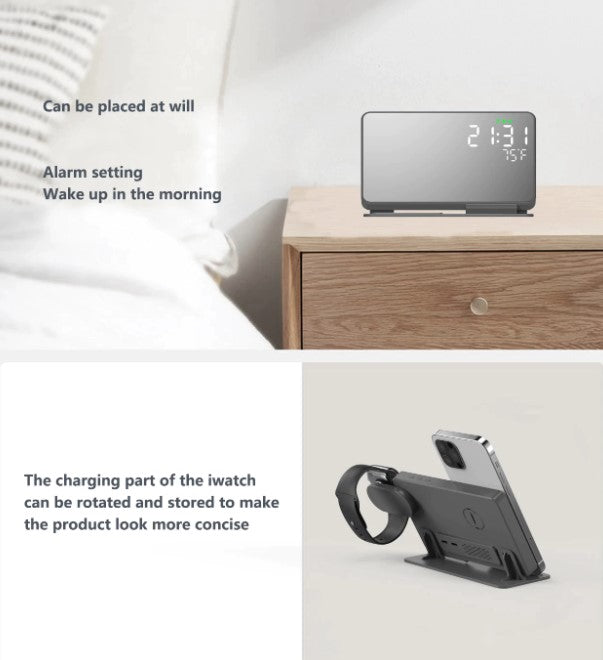 Make your life easier and more organize with this 3 in 1 wireless charging station. Modern design, it has convenience features such as wireless charging for Qi compatible phones, airpods, and apple i-watch. It also has a large alarm display as well as temperature display.