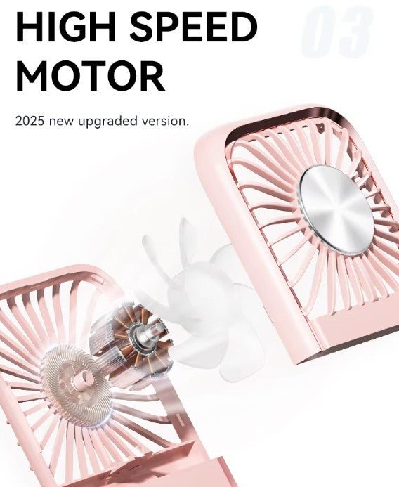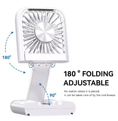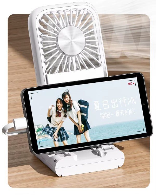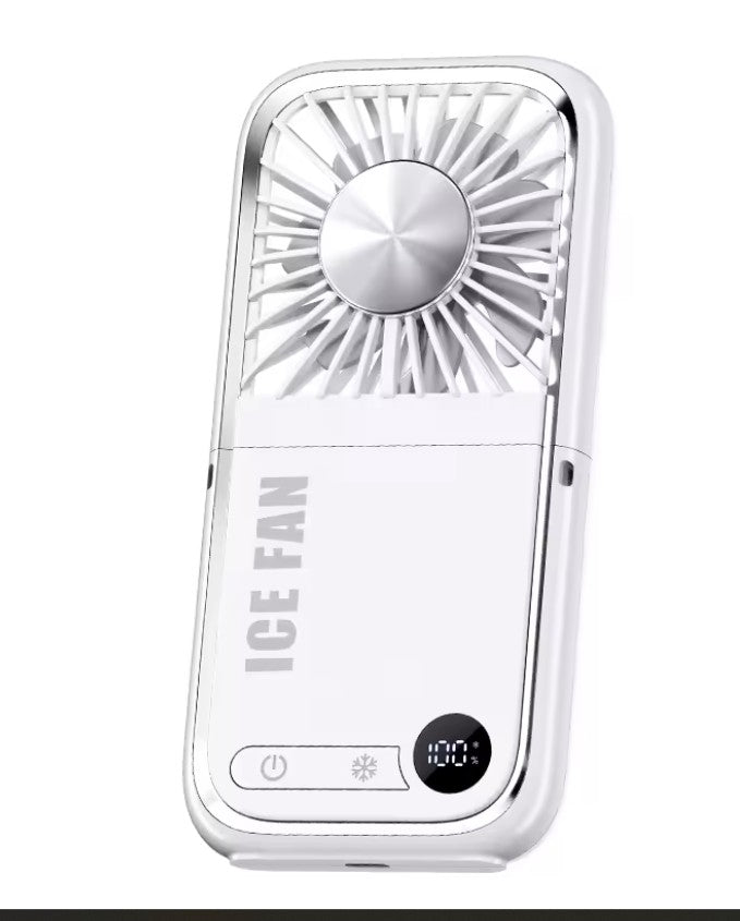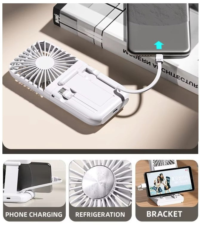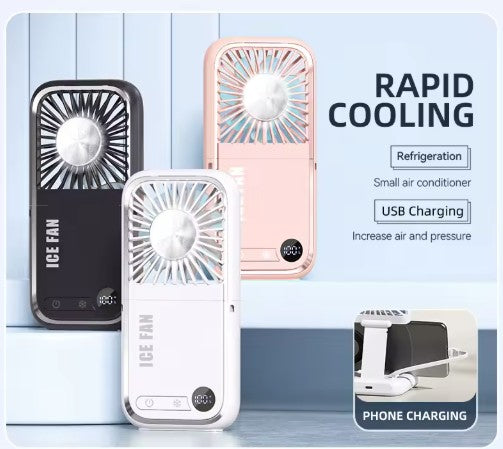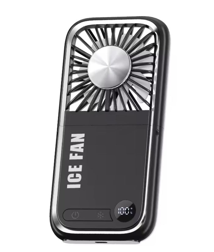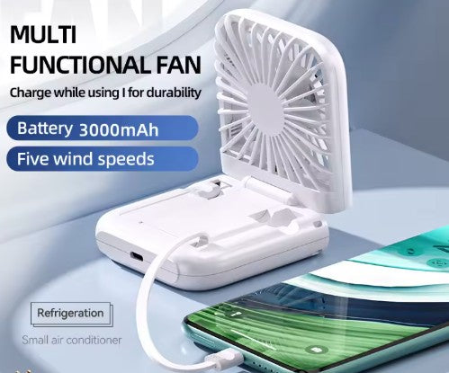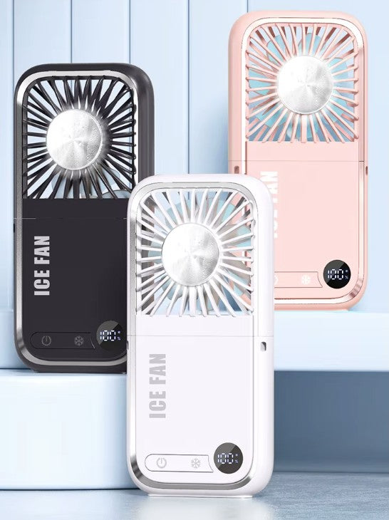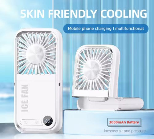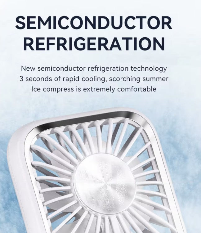 Enjoy every summer with this creative and functional handheld fan with semiconductor cooling plate; as well as powerbank and phone holder. This fan has a semiconductor refrigeration plat for cold compress, along with with 5 different gear selections. It can also be used as a phone holder and its 3000 mAh capacity powerbank make charging your handy.