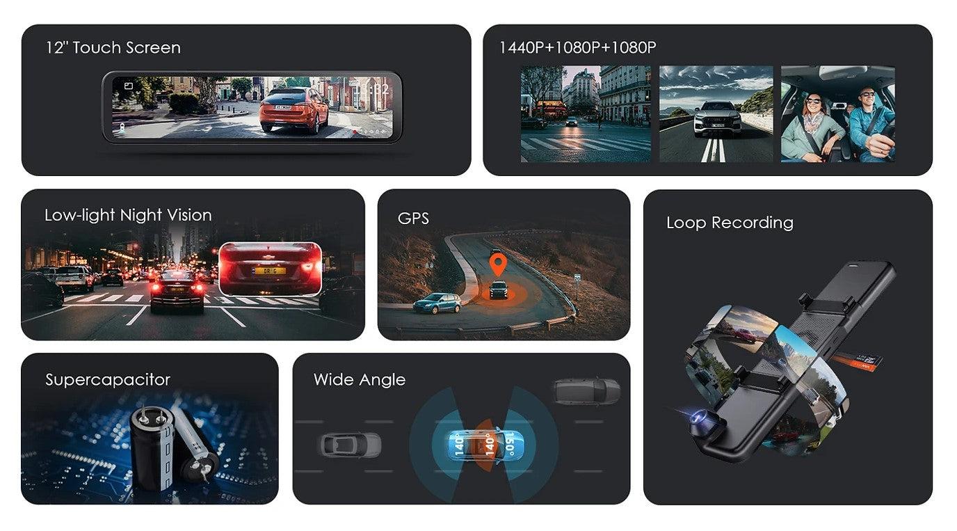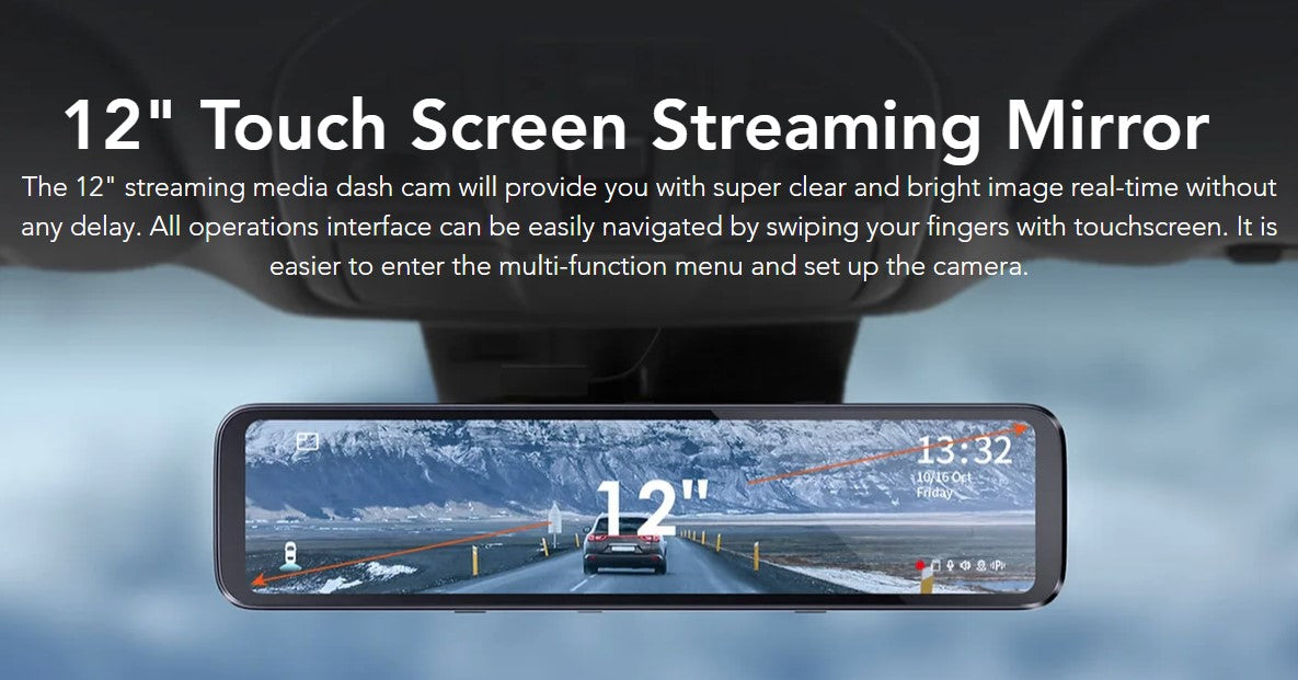 With this functional and advance mirror 3 channel camera, you now can enjoy a peace of mind for every of your trip. This mirror is truly multi-functional, it is design and build with advance features such as: 12 inch clear touch screen display with easy to use and setup functions, advance image sensor, IR LED cabin cam, HDR for rear cam, backup camera mode and other features
