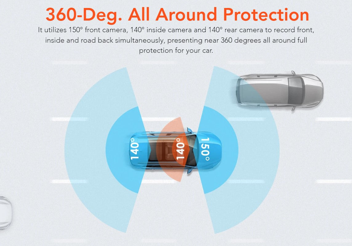 - Wide angle: 150 degree for front camera, 140 degree cabin cam and 140 degree for rear cam
