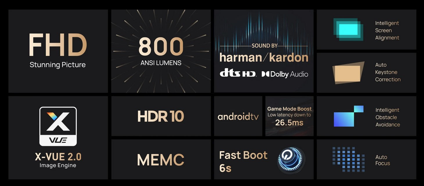 We have this new and advance thin projector for you. In its compact and thin size, it has all advance build-in features such as 1080p, 800 ANSI lumens quality, two build-in 3W Harman Kardon speaker, intelligent screen adjustment, premium quality surround sound and many more !